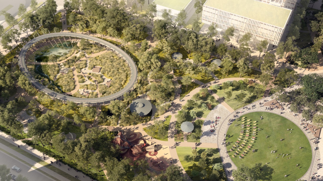More than 550 mature trees and 70,000 species of native plants will create a green oasis with public art, active learning, and gathering spaces. The design also features a muti-generational interwoven play area and a Gathering Green for major community events.